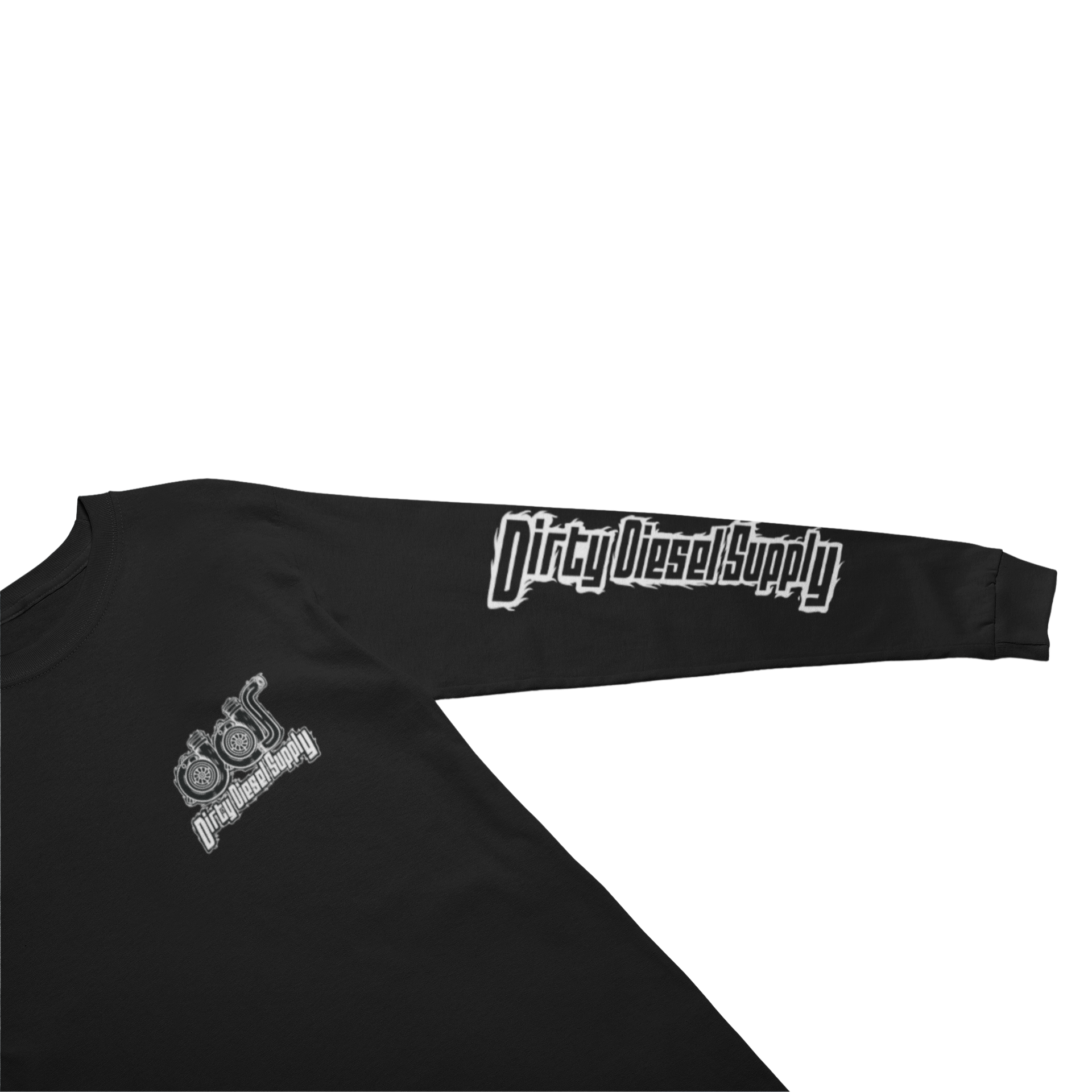 Our Black and White Turbocharger Logo printed on the front left chest and Dirty Diesel Supply running up & down the arms