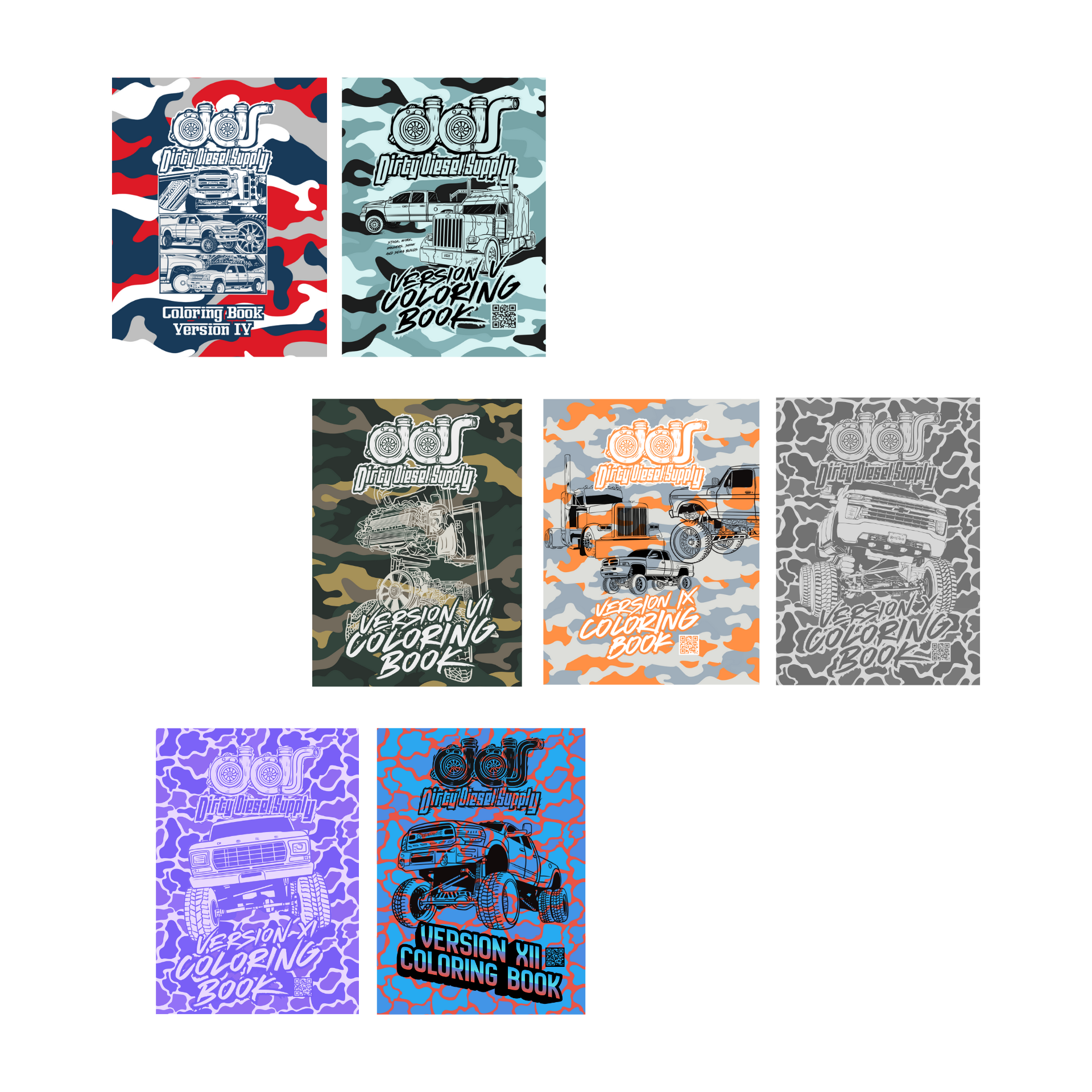 More trucks, more pages, more diesel attitude — all in one killer bundle. This Dirty Diesel Supply Coloring Book 7-Pack includes Versions 4, 5, 7, 9, 10 , 11 and 12 stacked with our fan-favorite hand-drawn trucks, semis, lifted builds, and rigs that rule the shows and backroads alike.